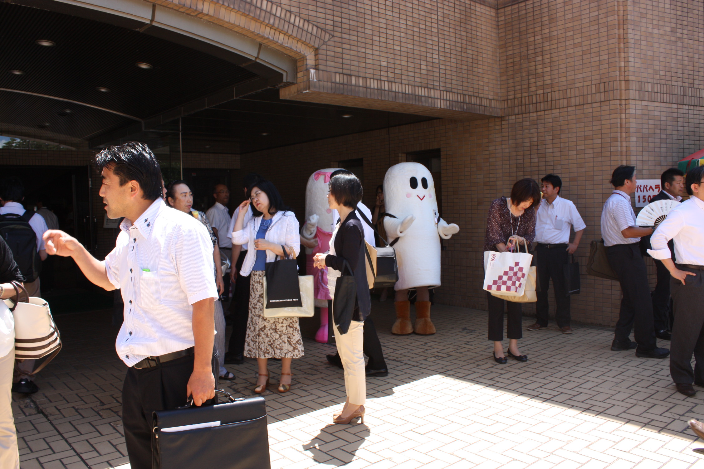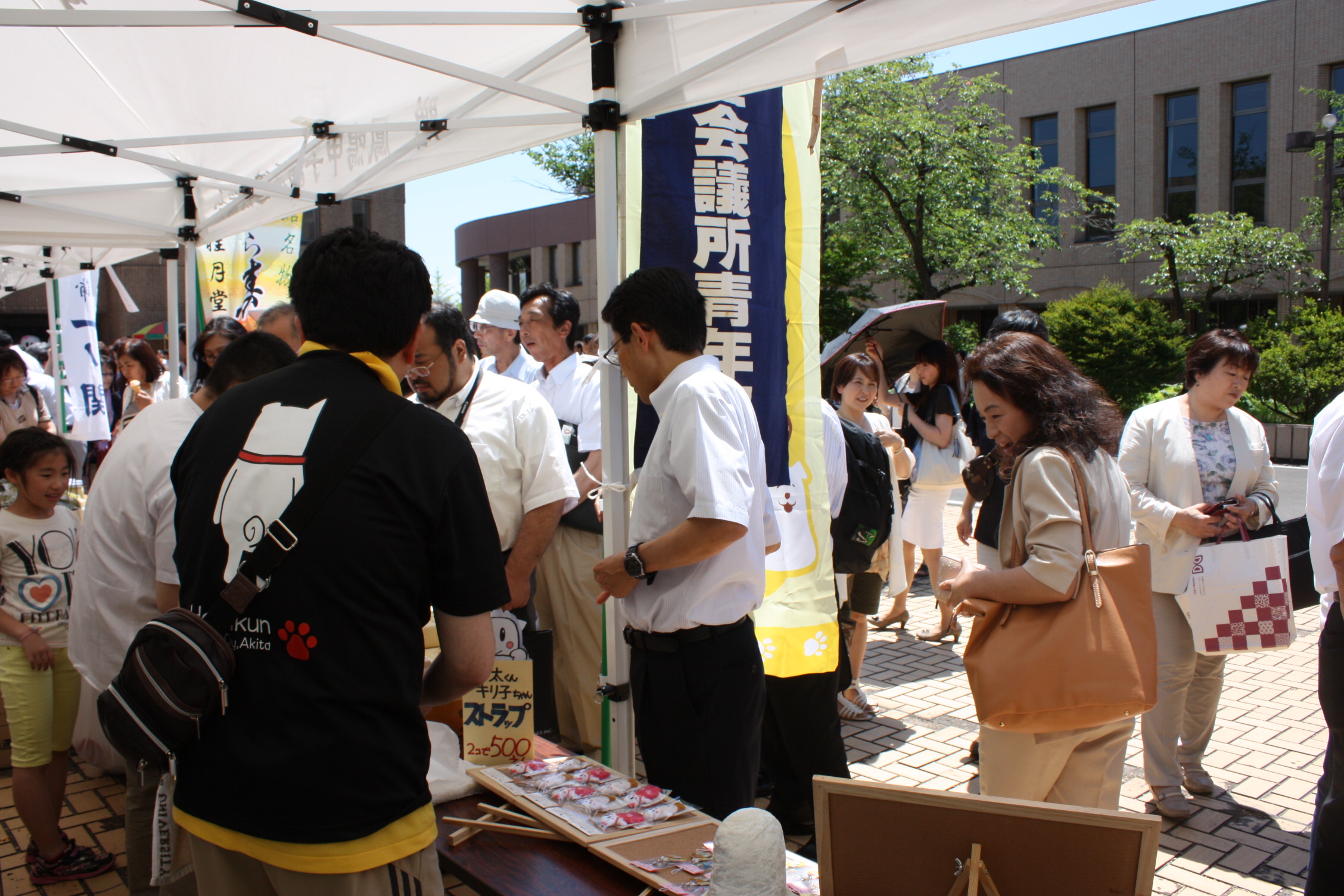 7月の暑い中その大会は始まった。朝8時集合と共に準備開始。大館YEGはジャンボフランクとババヘラアイスとポン太・キリ子ストラップを販売。ポン太・キリ子の人気ぶりはかなりのもので記念撮影で多くのお客様が足を止めた。ストラップも売れて追加するほどであった。