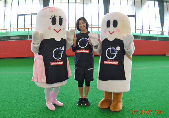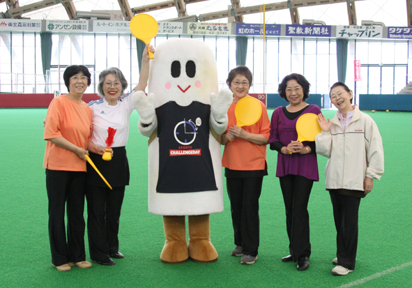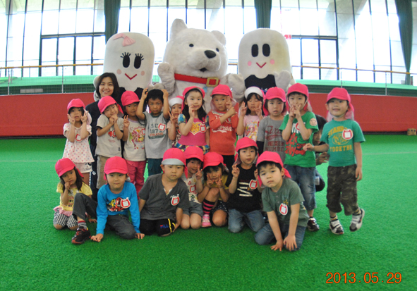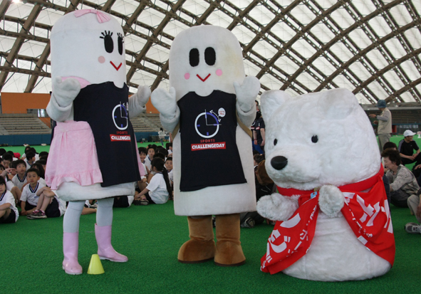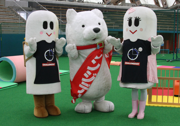 去る5月29日、樹海ドームにてチャレンジデーが開催され、我々、商工会議所青年部にポン太・キリ子の出動依頼が・・・・・。長木保育園と長木小学校の生徒さんを始め、地元の年齢を感じさせない元気なお年寄り等多数参加!大館市民(78,191人)みんなで運動をして大阪府の柏原市(人口72,769人)とその参加人数を競うという企画。それで集った精鋭達に激励したのは今も変わらず美人な元オリンピック選手”長崎宏子”さん(^-^)/美女の元気いっぱいの激励に集った精鋭達はやる気満々!ボルテージ全開!(実はポン太とキリ子そっちのけで長崎さんの美貌に釘付けでした・・・。)そしてちゃっかりポン太・キリ子は長崎宏子さんとのふれあいを来場者よりも先にして記念撮影までしました。でも美女を挟んだ感想は”あまりの美しさに悶絶”だそうです。その後、保育園の子供達や小学生の子供達ともふれあい記念撮影をして業務終了・・・・。撮影協力して頂いた大館製作所・中田峻君、アバフローリスト・野田光平君そして事務局・塚田悠紘君ありがとうございました。そして今回の撮影やホームページ掲載に許可をしてくださった長木保育園・長木小学校の生徒・保護者・先生方ありがとうございました。